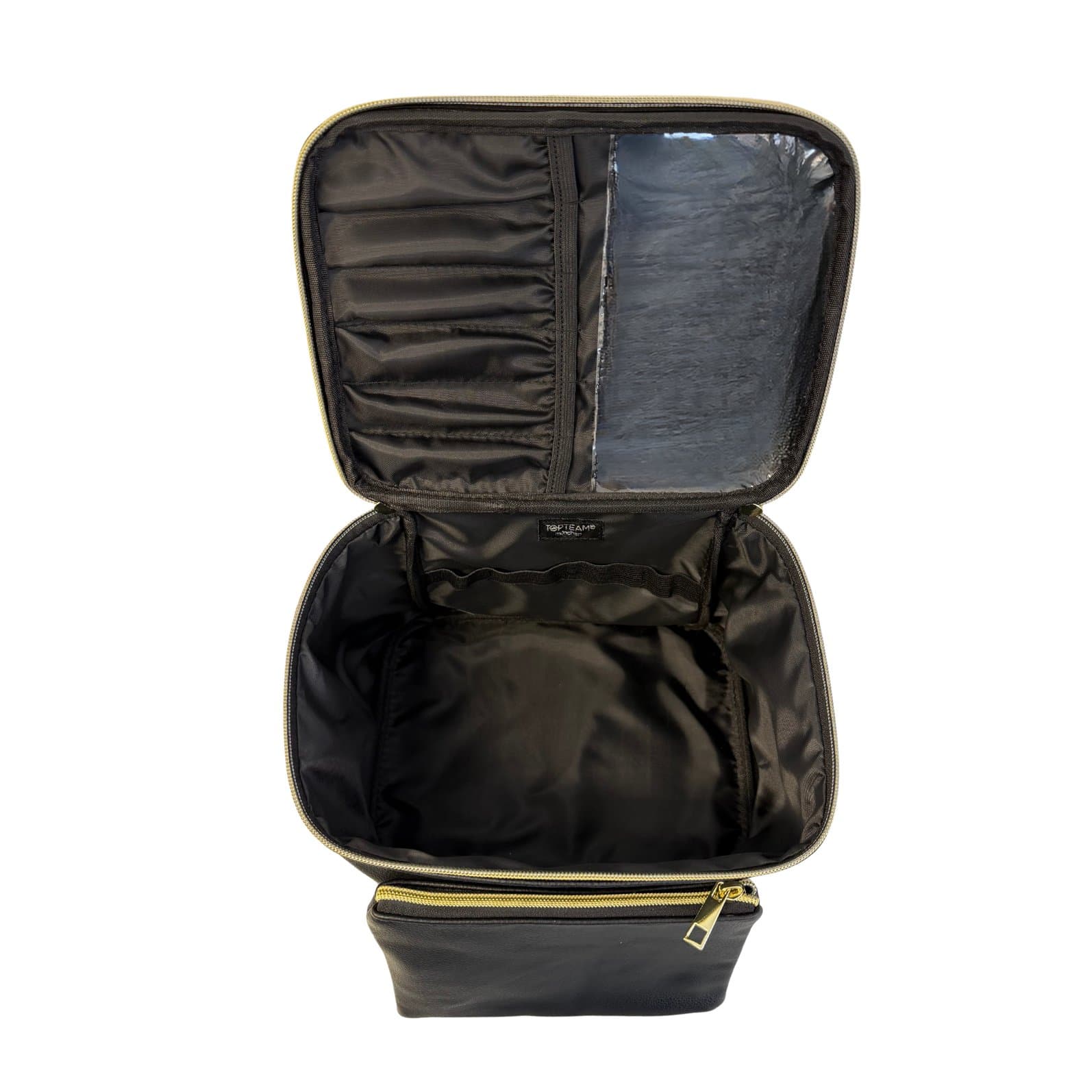 Priestranný kufrík je vyrobený z vodoodpudivej umelej kože a je vybavený pevným dvojitým zipsom. Samostatné priehradky vo vnútri umožňujú prehľadné usporiadanie štetcov na make-up. Integrovaná PVC vrstva pritom uľahčuje čistenie. Priložená menšia kozmetická taštička je ideálna na rúže, očné tiene alebo iné drobnosti. Vďaka ozdobnej darčekovej stuhe je toto balenie krásnou pozornosťou na príležitosti, ako sú Deň matiek alebo Valentín.