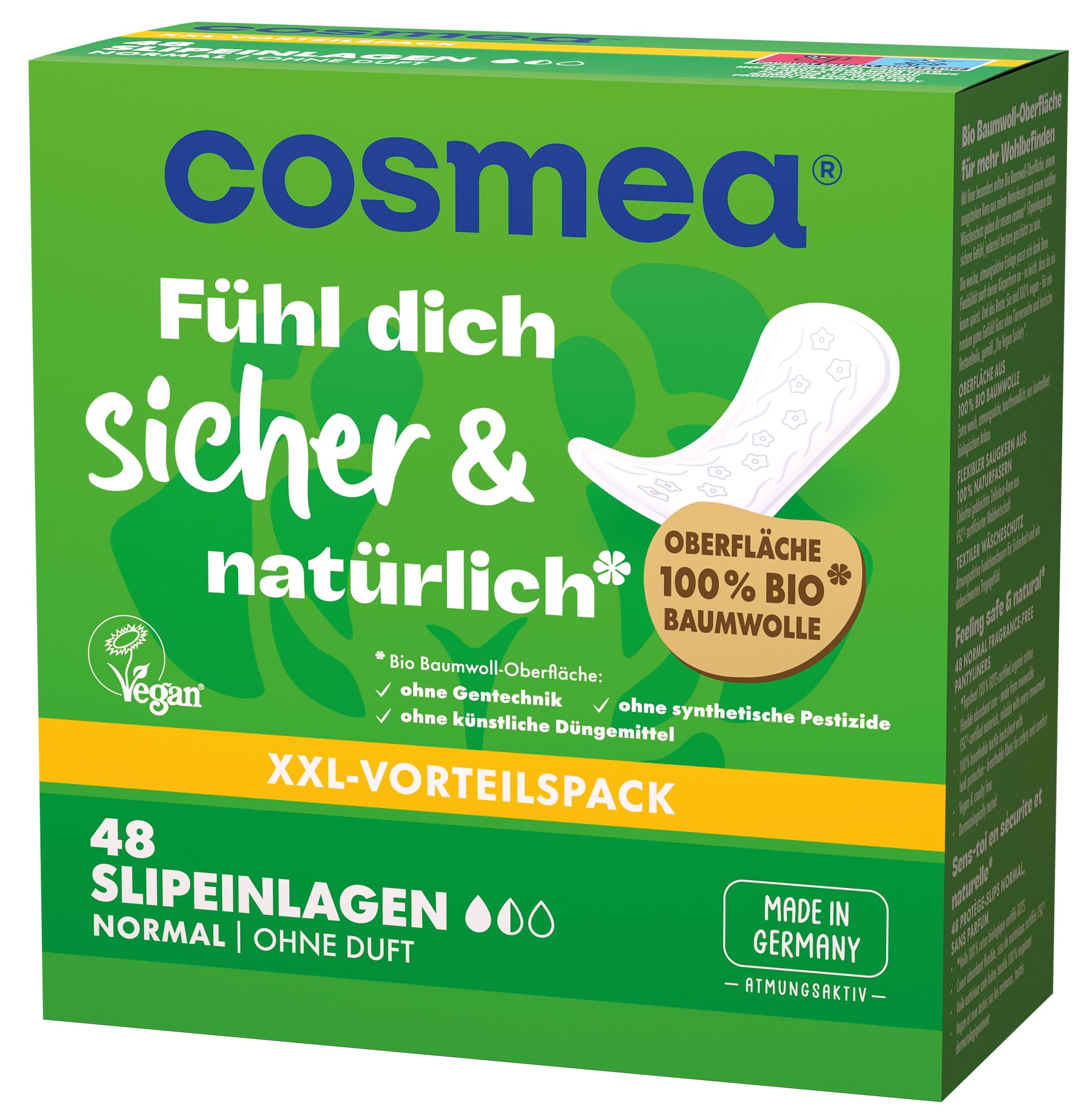 Organické hygienické vložky Cosmea®, vegánske, bežné, bez vône, balenie 48 kusov, XXL výhodné balenie
