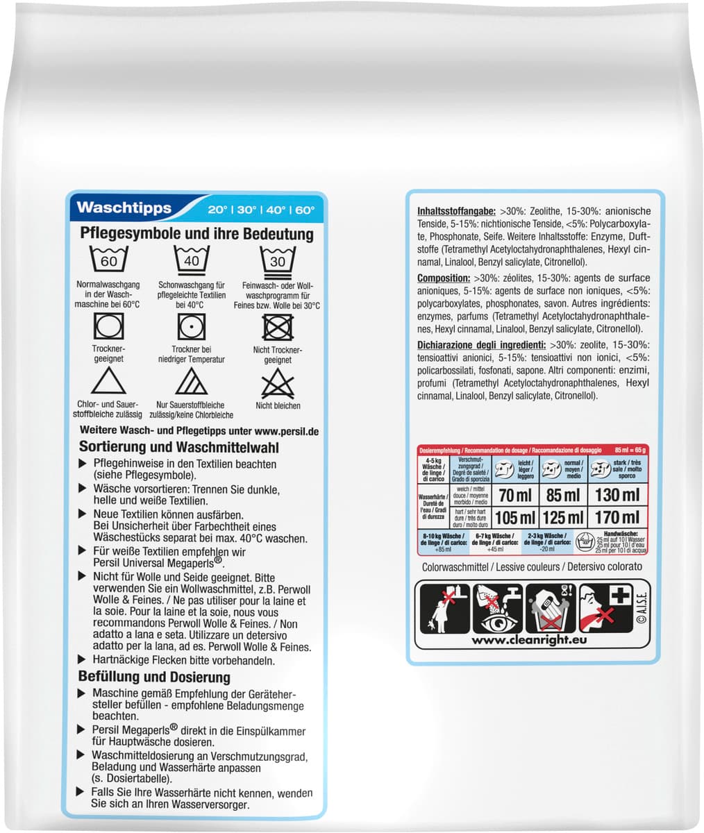 Persil Color Megaperls zaisťujú hĺbkovú čistotu bielizne a dodávajú oblečeniu žiarivé farby. Výkonné zloženie účinne odstraňuje škvrny a súčasne zanecháva v práčke príjemnú sviežosť.